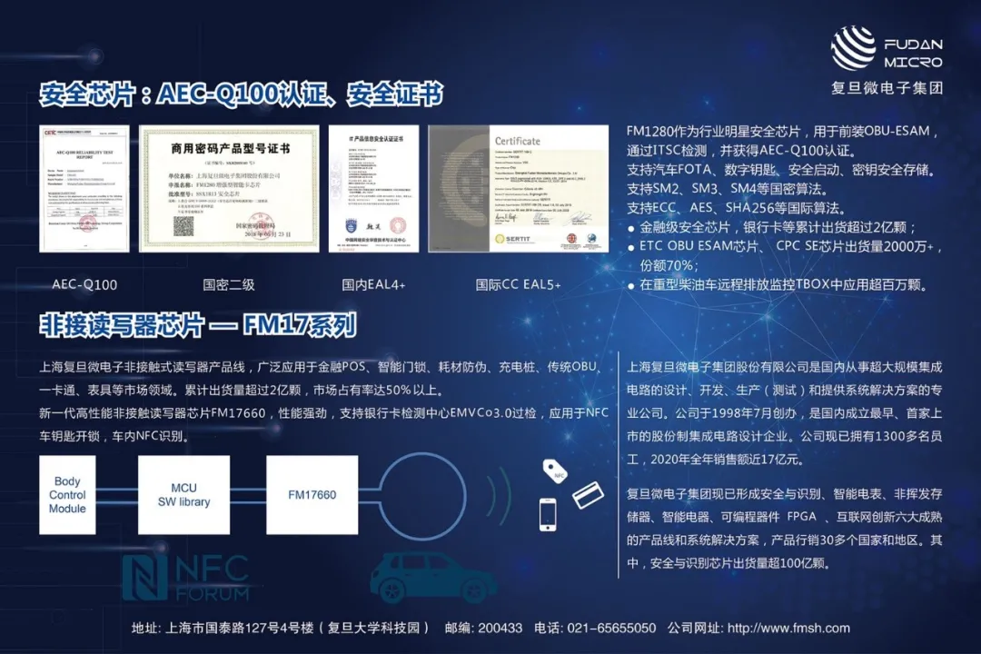 本次亮相,復(fù)旦微電子向公眾展出了包括安全芯片SE、非接觸讀卡器芯片在內(nèi)的車規(guī)級安全識別解決方案。其中,復(fù)旦微電子安全芯片SE具備較高的安全等級,獲得國內(nèi)EAL 4+安全認(rèn)證,國際CC EAL 5+認(rèn)證,符合國密二級。在物聯(lián)網(wǎng)領(lǐng)域得到了廣泛的應(yīng)用,并且已經(jīng)獲得AEC-Q100認(rèn)證。